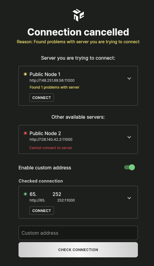 - Unhealthy (yellow) - MIRO will not connect automatically. User consent is required to connect if INTERX provides a correct response from the /api/status endpoint, but the INTERX version is not supported by MIRO, or the difference between the last block time and local user time exceeds 5 minutes.